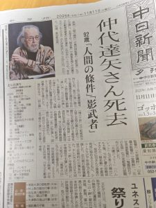 中日の本日付夕刊1面見出しに【仲代達矢さん死去 92歳「人間の條件」「影武者」】の訃報。惜しい人が逝ってしまわれた。記事の総合リードは次のようなものだった。