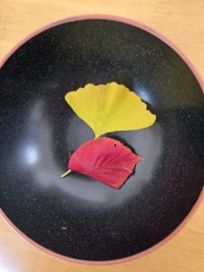 花霞町内会による恒例の神社境内の清掃奉仕があったためで、清掃の合間には地区の方々とも久しぶりにお会いし、あいさつを交わした。境内では落ち葉掃きなどをしたが、なかに真っ赤な葉と黄色の葉があったので思わずスマホで撮影し、この二葉をポケットに入れて持ち帰り、帰宅したところで今は亡き愛する妻たつ江(伊神舞子)と愛猫シロちゃん(オーロラレインボー)の遺影の前に供え、手を合わせたのである。