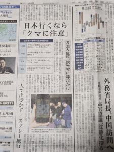 日経17日付夕刊【日本行くなら「クマに注意」 各国大使館、観光客に呼びかけ 一人で出歩かず スプレー携行】の記事