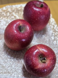 妙子姉さんからもらったデッカイりんごと繁さん、和代からのニューヨーク菓子