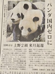 パンダがゼロに。なんとも寂しい限りのニュースを報じた16日付の毎日新聞朝刊