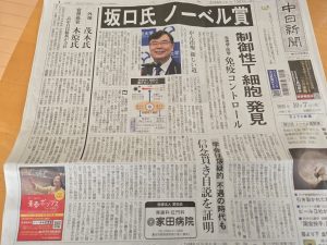 坂口志文さんのノーベル生理学・医学賞を報じた中日新聞