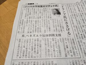 日経新聞夕刊に【ノーベル平和賞のマチャド氏 「トランプ氏にささげる」 米、ベネズエラ反体制派支援】の記事。分からぬこともないが。ここは、マチャド氏が受けておくべきだーと思うのだが。