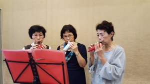 木曽川河畔の江南市に初お目見えした江南文芸村ブースと組織図、合間にオカリナの音色を披露する女性、会場はなごやかな空気に包まれた
