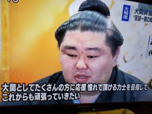 口上を終え、ホッとした表情で抱負を述べる正代(NHKの画面から)